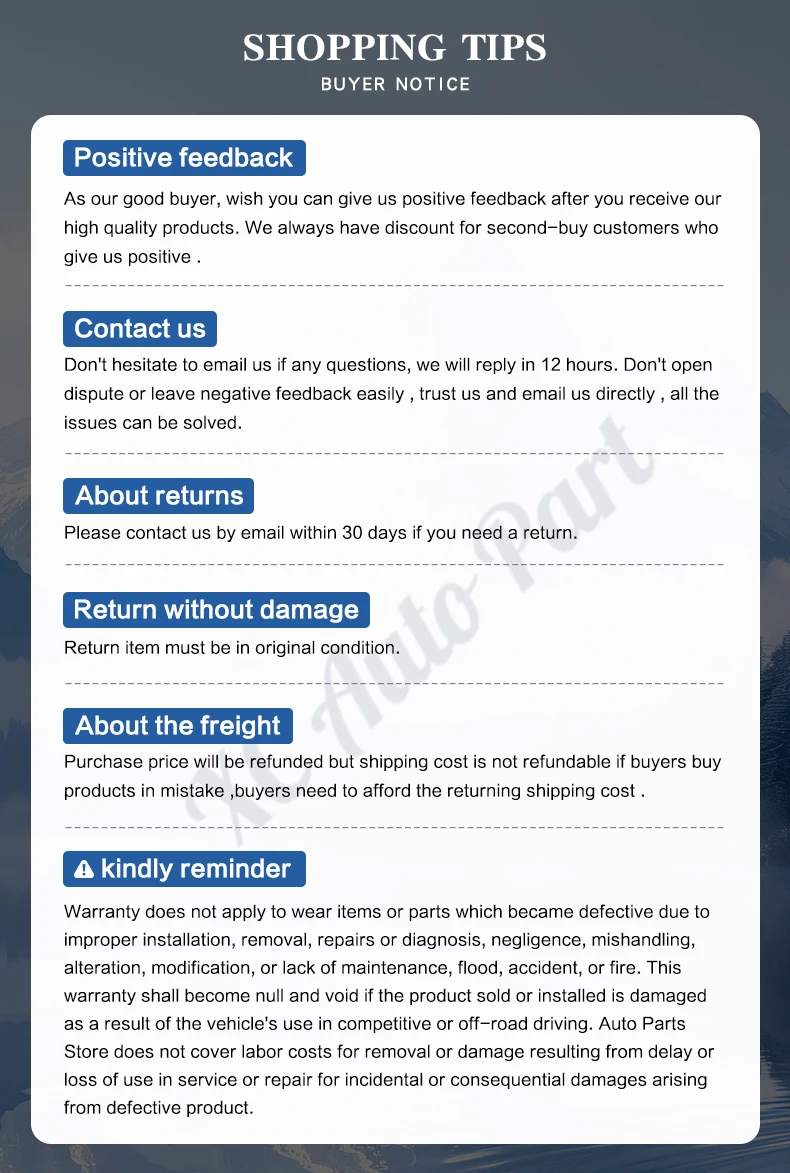 To ensure the accuracy of purchasing accessories, please send the vehicle identification code (VIN number) to customer service for inquiry!!!
